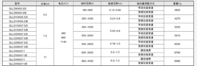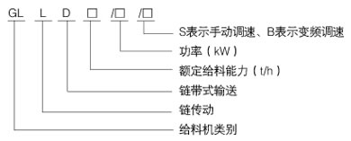 示例:客定給料能力為1000t/h,裝載功率為5.5KW的手動調(diào)速鏈帶式給料機(jī)型號表示為GLLD1000/5.5/S